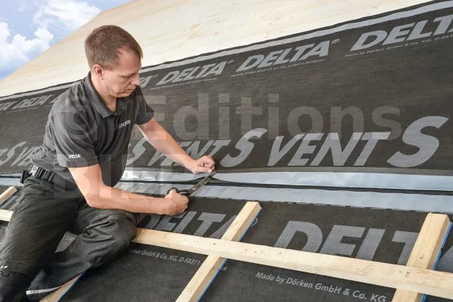 - MatériauÉcran de sous-toiture et pare-pluie tricouches PP composé de deux non-tissés en monofils continus désorientés, d'un film respirant avec deux bandes autocollantes intégrées.
