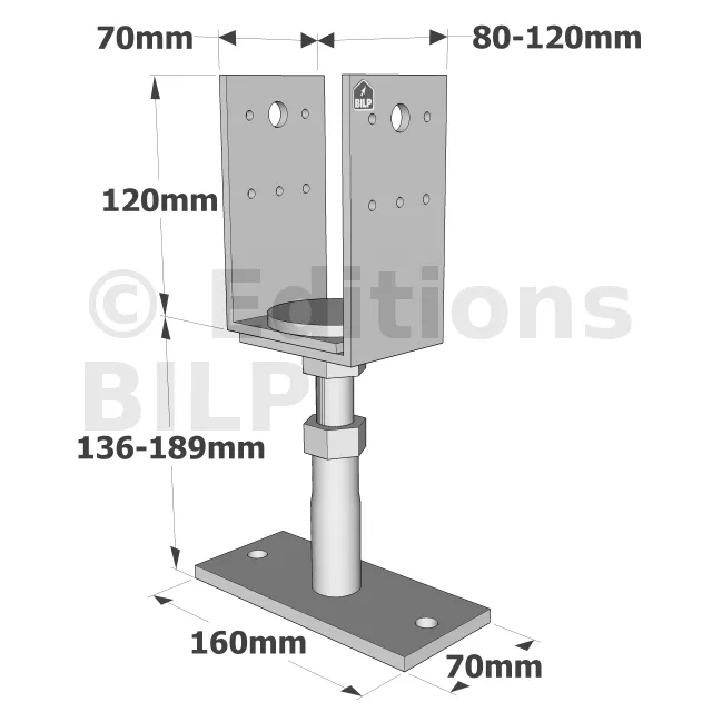 Pied de poteau réglable (hauteur et largeur) à fixer avec des ancrages - Réf. PVDB80G