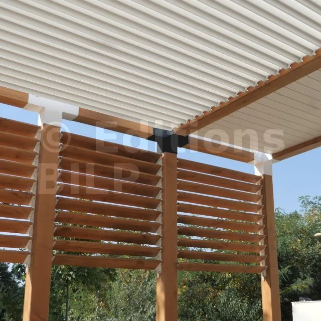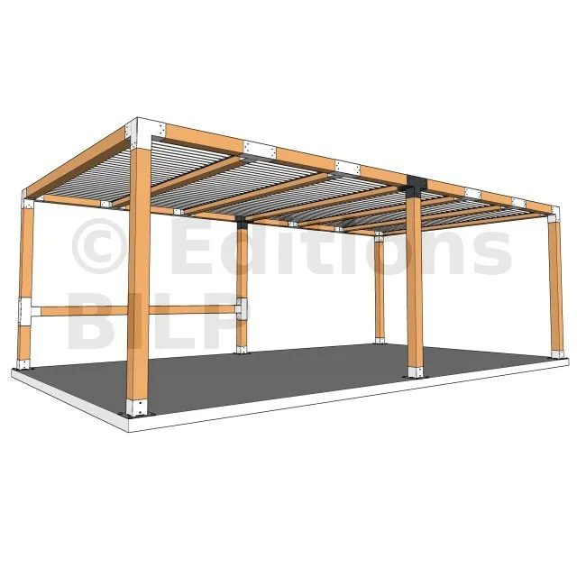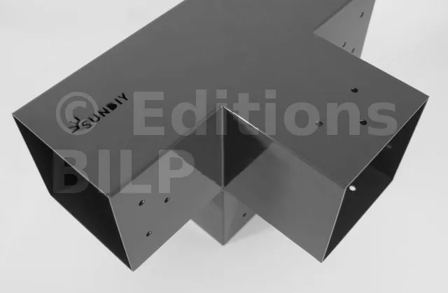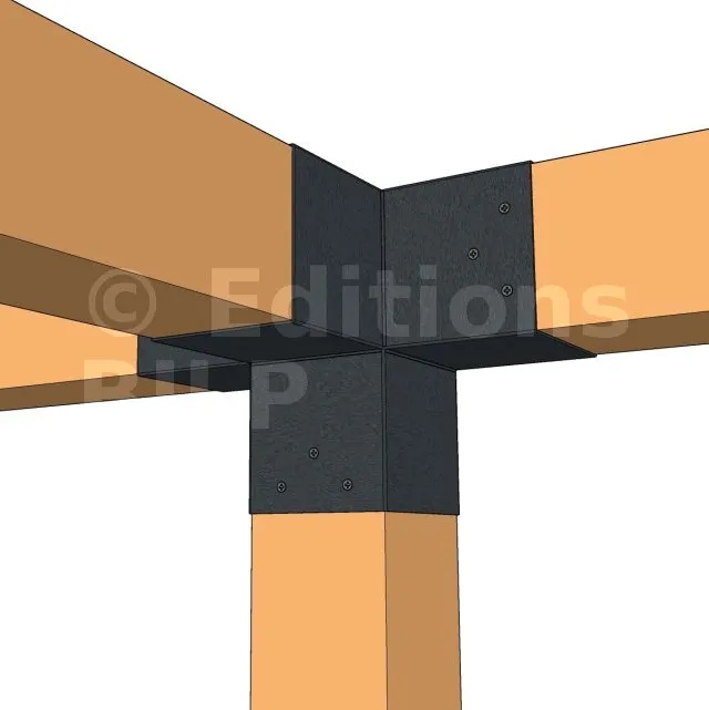 Il permet de raccorder une poutre de 90x90mm perpendiculairement à un chevron de 90x90mm, le tout étant supporté par un poteau vertical de 90x90mm.