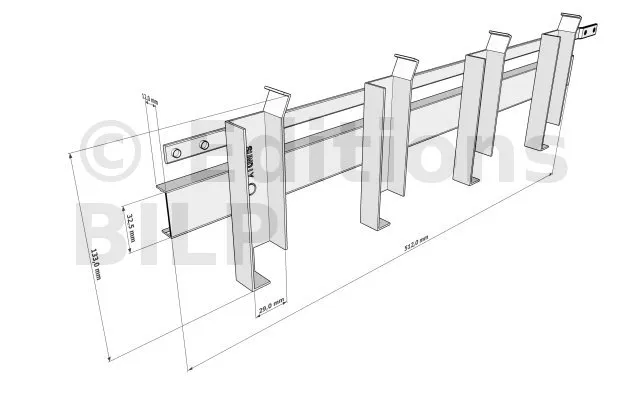 Distance entre les supports : A supposer que le mécanisme est fixé entre deux poutres, la distance entre ces deux poutres doit être égale à la longueur des lames + 35mm : 2 X 15mm (largeur du corps de mécanisme) + 5mm de jeu.