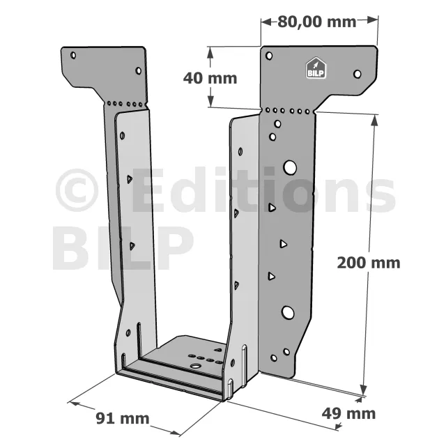 - Étrier fourni avec ses brides supérieures droites, pliables sur chantier afin de s’adapter à toutes les hauteurs de solives,