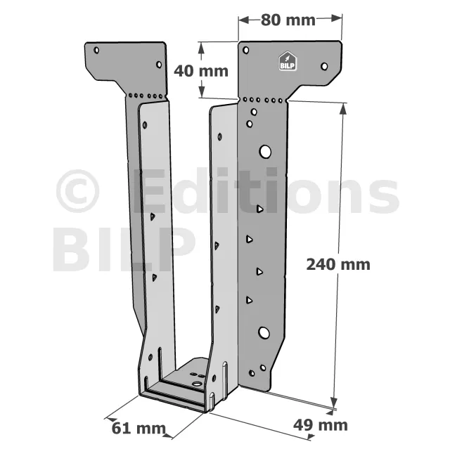 - Étrier fourni avec ses brides supérieures droites, pliables sur chantier afin de s’adapter à toutes les hauteurs de solives,
