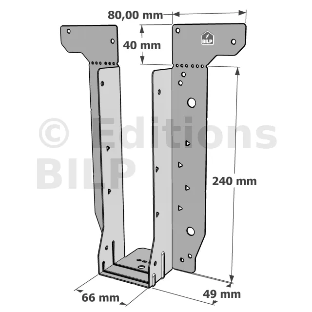 - Étrier fourni avec ses brides supérieures droites, pliables sur chantier afin de s’adapter à toutes les hauteurs de solives,