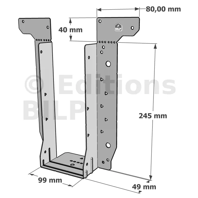 - Étrier fourni avec ses brides supérieures droites, pliables sur chantier afin de s’adapter à toutes les hauteurs de solives,