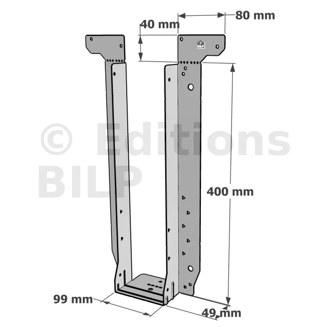 - Étrier fourni avec ses brides supérieures droites, pliables sur chantier afin de s’adapter à toutes les hauteurs de solives,