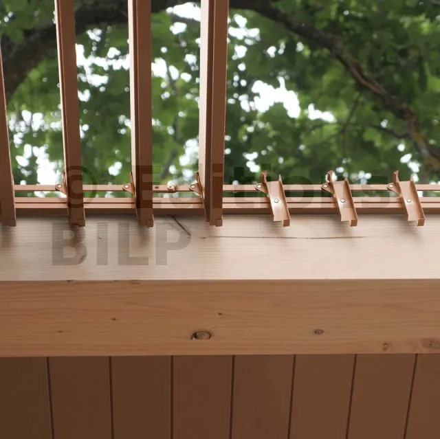ATTENTION : Pour une utilisation avec du bois, les lames doivent être d’un mètre maximum. Proscrire les essences instables ou avec des nœuds importants. Utiliser des bois stables type Red Cedar de qualité menuiserie ou bien prenez des lames en Douglas. Prendre le calibrage de nos lames et surtout pensez à laisser de la dilatation.