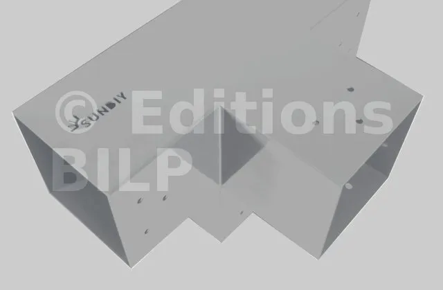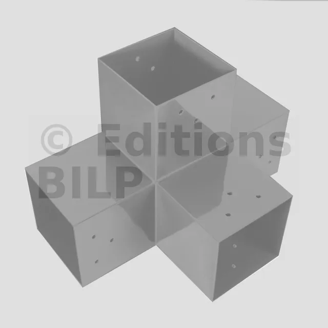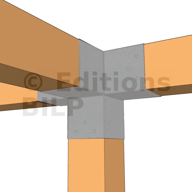 Il permet de raccorder une poutre de 120x120mm perpendiculairement à un chevron de 120x120mm, le tout étant supporté par un poteau vertical de 120x120mm.