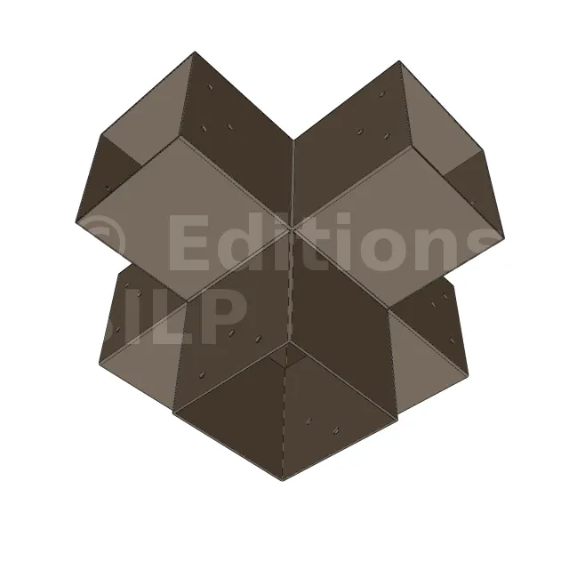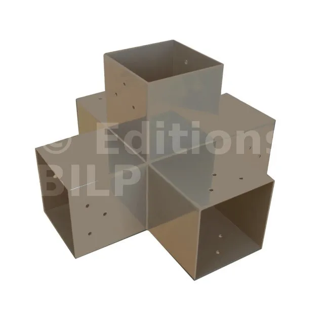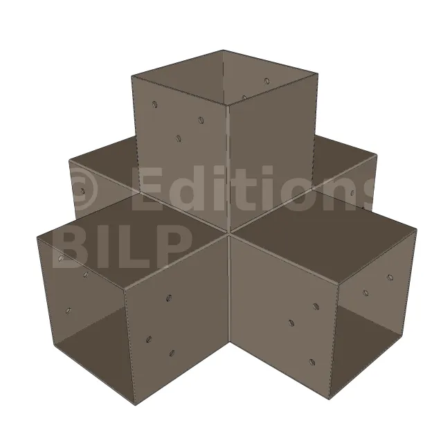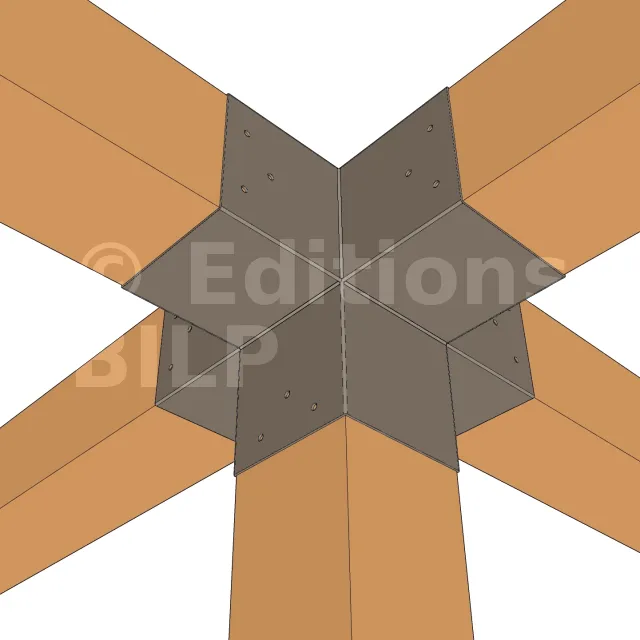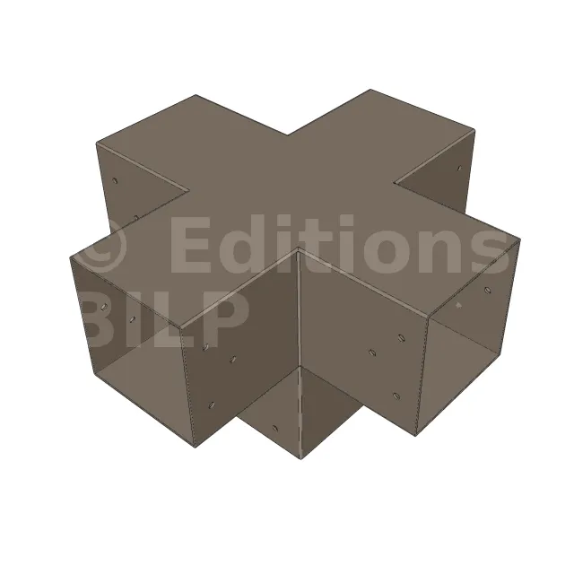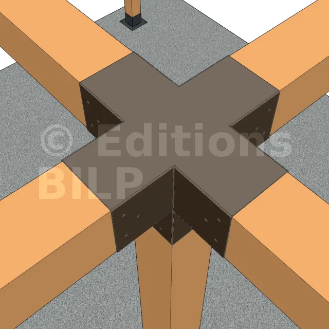 Il permet de raccorder deux poutres 120x120mm perpendiculairement à une autre poutre 120x120mm, le tout étant supporté par un poteau vertical de 120x120mm.