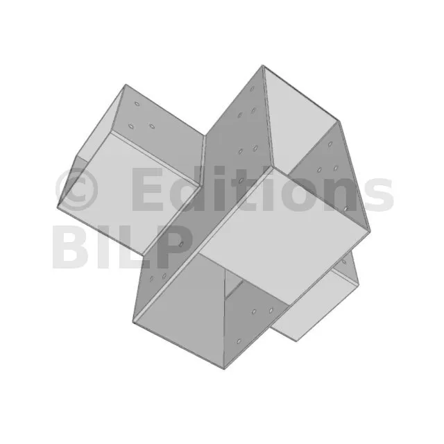 Il permet de raccorder deux poutres 120x120mm perpendiculairement à une grosse poutre 240x120mm, le tout étant supporté par un poteau vertical 120x120mm.