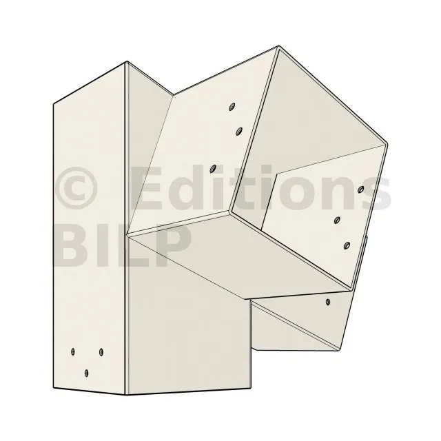 Il est utilisé dans un angle extérieur. Ce connecteur va permettre de raccorder une poutre 120x120mm à une poutre 120x120mm avec une pente de 20°, le tout étant supporté par un poteau vertical 120x120mm.