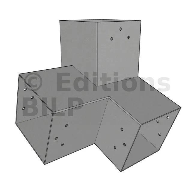 Il est utilisé dans un angle extérieur. Ce connecteur va permettre de raccorder une poutre 120x120mm à une poutre 120x120mm avec une pente de 20°, le tout étant supporté par un poteau vertical 120x120mm.