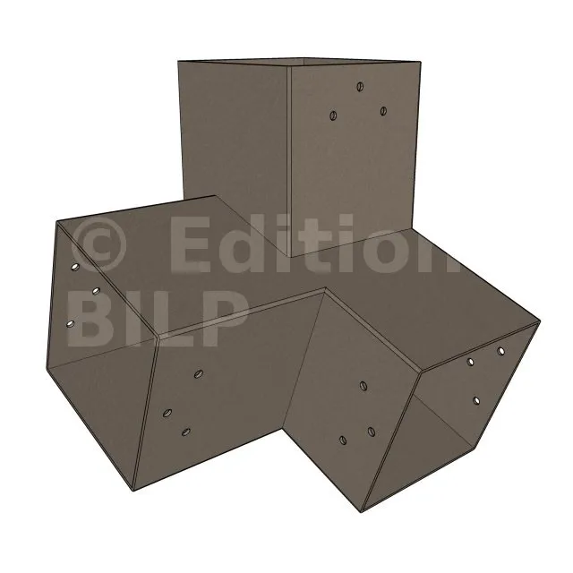 Il est utilisé dans un angle extérieur. Ce connecteur va permettre de raccorder une poutre 120x120mm à une poutre 120x120mm avec une pente de 20°, le tout étant supporté par un poteau vertical 120x120mm.