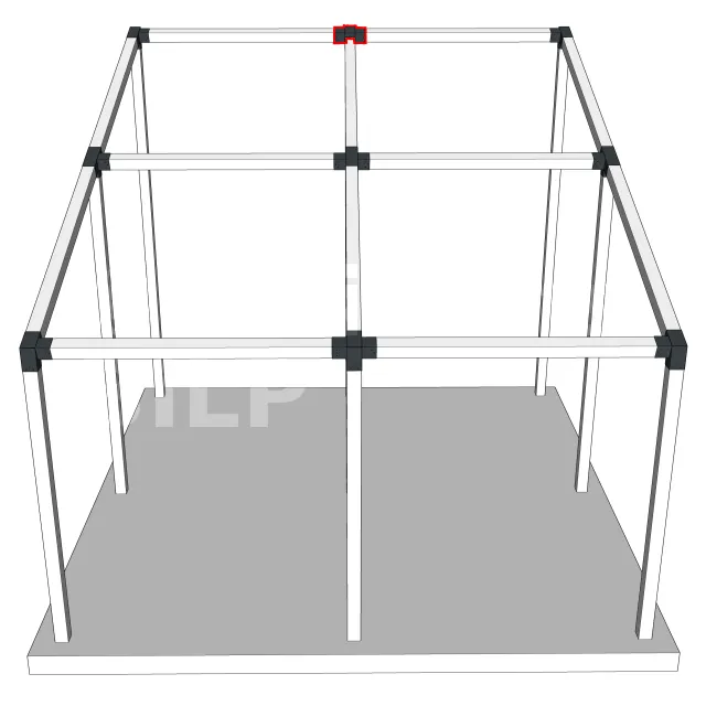 Connecteur d’angle intérieur à quatre directions conçu pour l’assemblage de poutres en section 120x120 mm avec un chevron de même section incliné à 20°. Il assure la jonction structurelle entre les éléments horizontaux, le chevron incliné et un poteau porteur vertical en 120x120 mm.