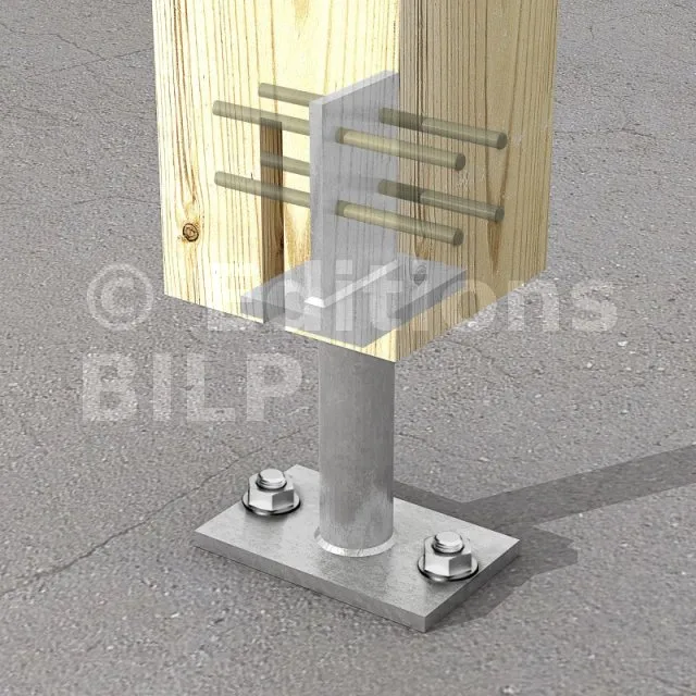- Connexion bois sur support rigideSur poteau : 4Ø8 (broches STD) ; sur béton : 2Ø12 (goujons WA ; tige filetée)