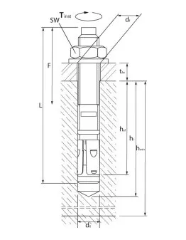 | Références | Ø perçage [d0] [mm] | Prof. min. de perçage [h1] [mm] | Ø perçage dans pce à fixer (au travers) [df] [mm] | Ouverture de clé sur plat [SW] [mm] | Couple de serrage [Tinst] [Nm] | Prof. ancrage [hef] [mm] | Ep. mini du support [hmin] [mm] | Distance entraxes caractéristique(5) [scr,N] [mm] | Distance au bord caractéristique [ccr,N] [mm] |