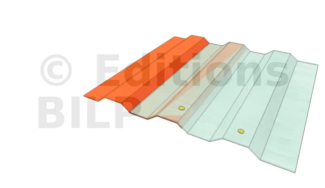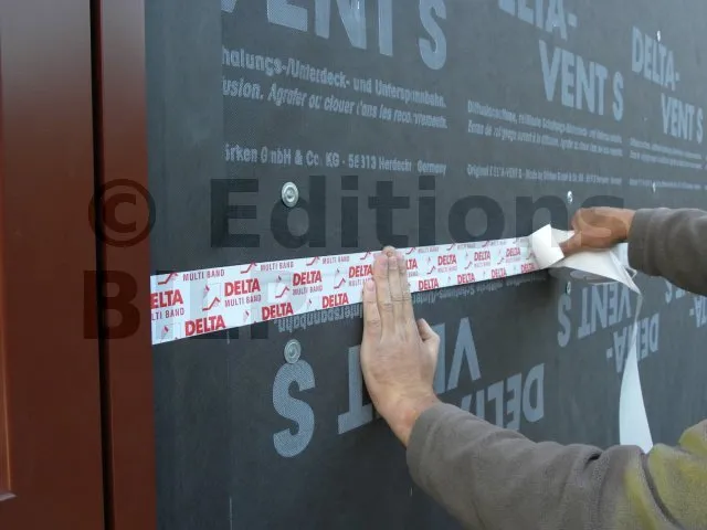 - Les feuilles à assembler doivent être posées et fixées sans tension ni pli, avec des recouvrements intégralement collés sans contrainte de cisaillement ou de pelage. La température du support doit être supérieure à +5°C et la bande adhésive doit être tempérée avant utilisation. Il est important de s’assurer qu’aucune contrainte n’apparaisse après le collage, notamment à la suite de la mise en place d’un lattage pour éviter un affaissement.