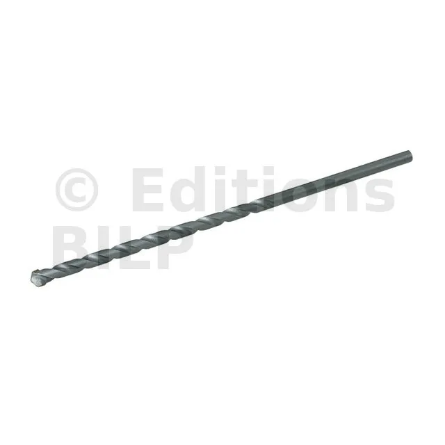 Tige en acier trempée au carbure de tungstène brasée au cuivre. Indiquée pour le béton, la brique et la pierre. Compatible avec les perceuses à percussion.