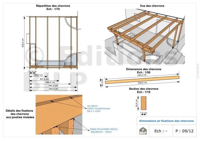 Autre point très important, votre construction doit être convenablement dimensionnée (sections et dimensions des éléments) selon la norme EUROCODE 5. Il y a de nombreux calculs à faire. Si vous surdimensionnez, vous allez dépenser de l’argent inutilement et obtenir un résultat esthétique de type "blockhaus". Si vous sous-dimensionnez, vous risquez de vous prendre la toiture sur la tête, blesser gravement quelqu’un (ou pire) et votre responsabilité serait engagée. Il faut dimensionner la structure selon les normes et les règles de l’art.