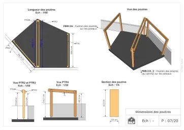 Les plans de structure à l’échelle sont faciles à lire et à comprendre. Ils vous permettrons de réaliser vous-même la structure de votre projet. Les détails de réalisation sont indiqués. Nous calculons et optimisons les dimensions et les sections de pièces de bois.