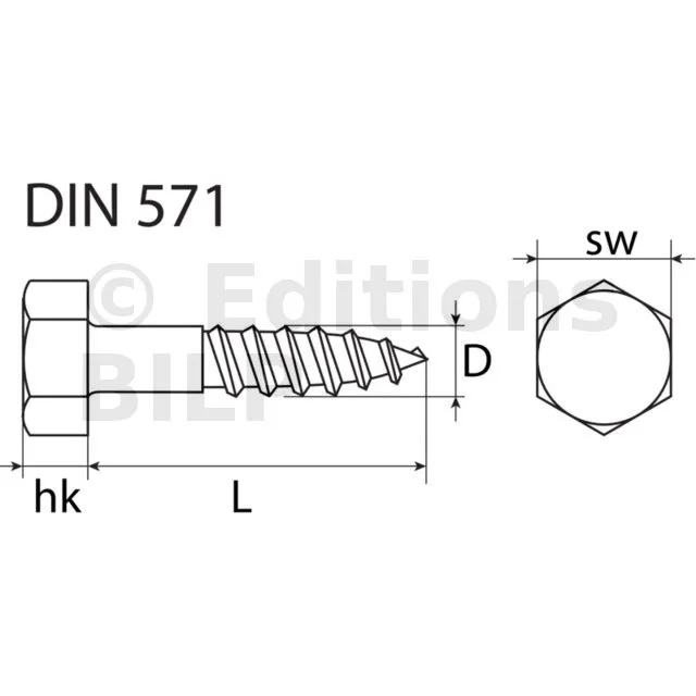 DIN 571 est une norme allemande pour une vis à bois hexagonale. Les vis DIN (Deutsches Institut für Normung) sont des standards techniques reconnus en Allemagne et internationalement pour leur précision et leur qualité.