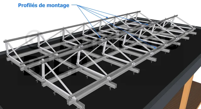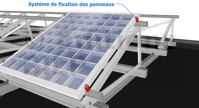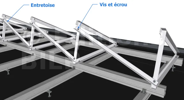 Pour finir l’installation, il vous faudra mettre en place les panneaux. Pour ce faire, vous allez les placer sur les profilés de montage et les fixer grâce à l’ensemble des éléments du haut vers le bas de d’écrou, de rondelle de serrage, de douille d’écartement, de rondelle, le tout assembler par un vis à tête rectangulaire.