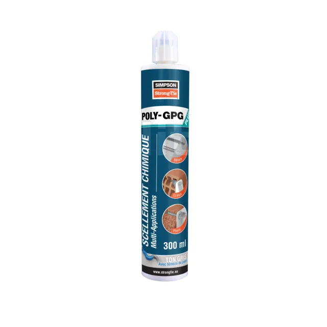 La résine multi-applications POLY-GPG Plus est préconisée pour la fixation de fers à béton, tiges filetées dans le béton non fissuré et dans les maçonneries creuses et pleines.