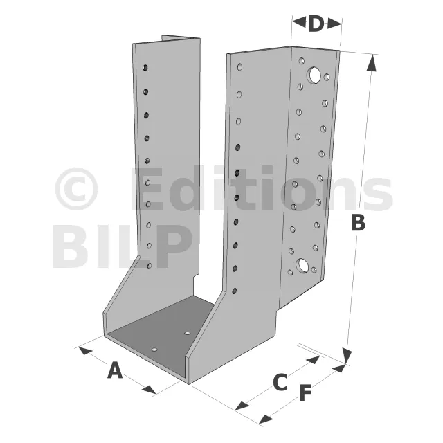 Les sabots GSE en acier galvanisé offrent une flexibilité grâce à des largeurs au choix selon les plages indiquées. Cette caractéristique permet de s’adapter parfaitement aux dimensions spécifiques des éléments de construction, garantissant une compatibilité optimale et une fixation stable.