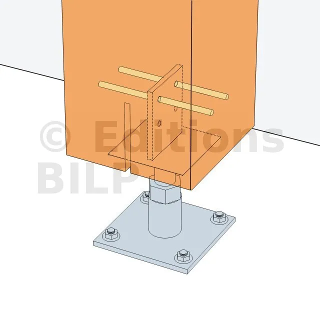 La connexion entre le pied de poteau et le poteau bois s’effectue à l’aide des deux broches supérieures.