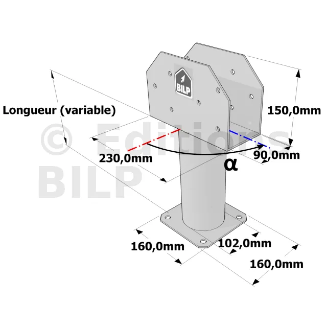 Poteau structurel OSP - D102mm - Platine haute en U 90x230x150mm - Embase 160x160mm