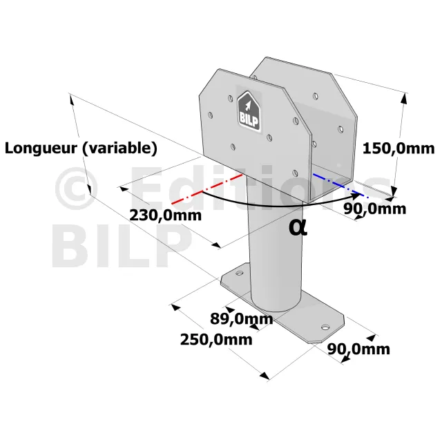 Poteau structurel OSP - D89mm - Platine haute en U 90x230x150mm - Embase rectangulaire 90x250mm