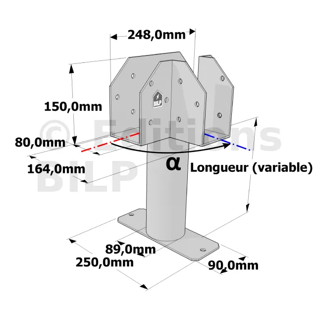 Poteau structurel OSP - D89mm - Platine haute en T 80x164x150mm - Embase rectangulaire 90x250mm