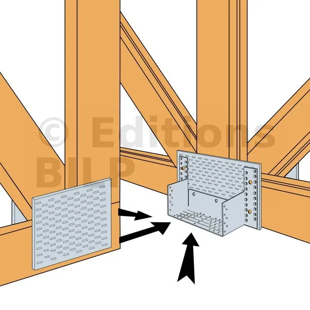Les étriers pour croupe sont utilisés dans la fermette de section 38mm. Ils permettent la réalisation d‘une croupe en assemblant les demi-fermes d‘arêtier et d‘empannon. Les modèles différent suivant le type de mise en œuvre.
