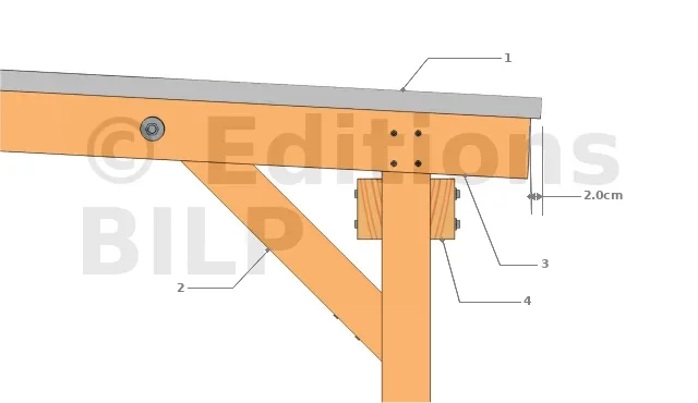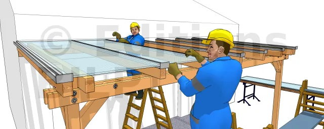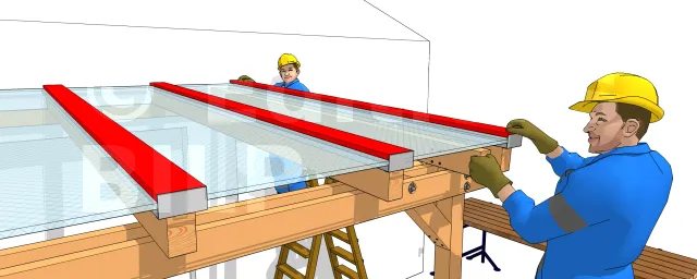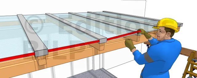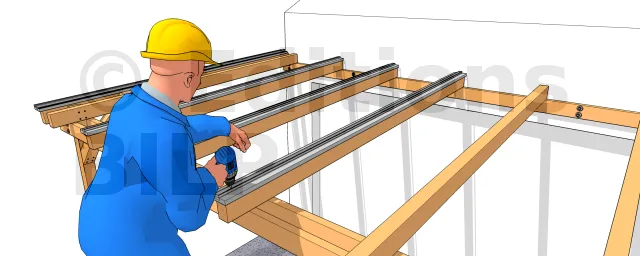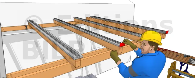 Positionner et visser les profilés de bordures et de jonctions sur les chevrons. Laissez dépasser environ de 2 cm chaque profilé de la traverse.