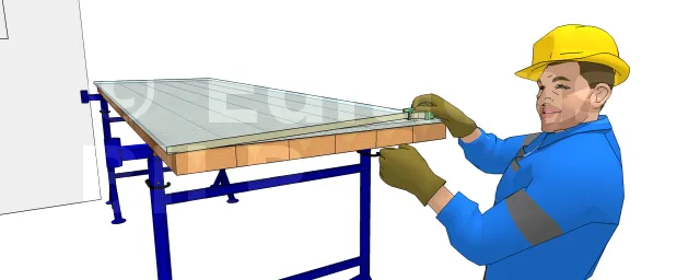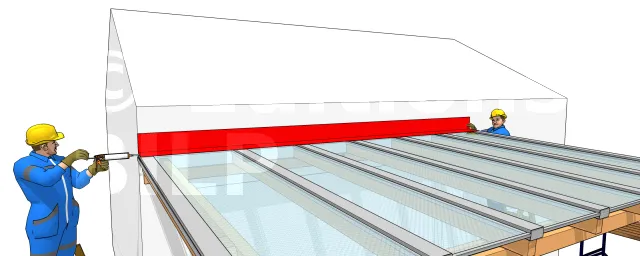 Après avoir retiré le film protecteur de la sous-face, positionner les plaques (face avec l’inscription : traité anti-UV - tournée vers le soleil), en laissant 5 mm de jeu entre les plaques et le bord du profilé pour la dilatation.