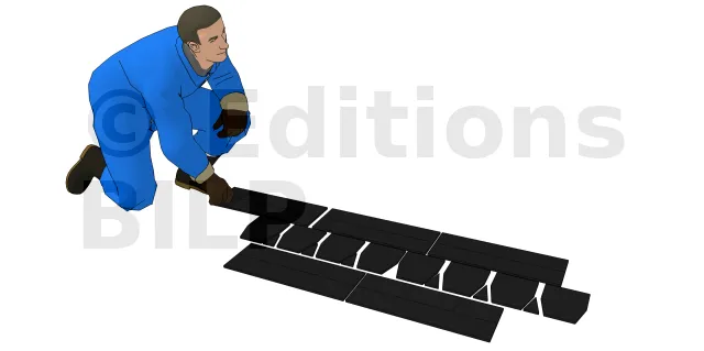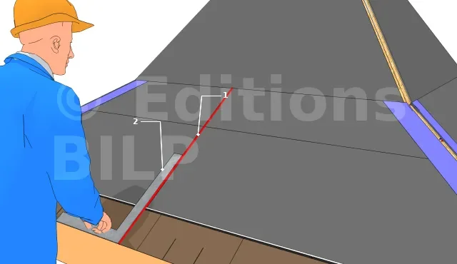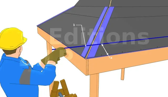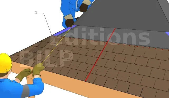 Bien mesurer la distance recommandée par le constructeur de la faîtière. Marquer la ligne de référence pour la coupe. Cette ligne est placée à cette distance par un cordeau à tracer de part et d’autre de la crête.