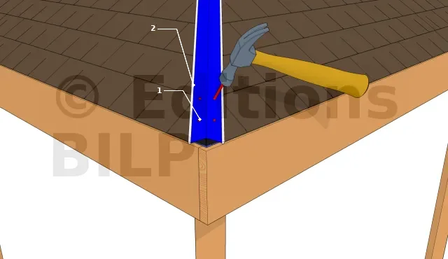 Avant d’ajouter une couverture à shingle, il est indispensable de protéger les bords de la toiture avec des larmiers fixés fermement contre la bande de rive. Le larmier est fait en aluminium malléable et est placé dans un angle avec une légère lèvre sur le bord pour éviter l’écoulement des eaux directement sur la bande de rive. Il suffit de couper une mitre de 45 degrés à chaque extrémité avec des cisailles métalliques et de bien les fixer avec des clous plantés tous les 30 cm.
