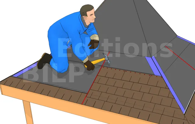 Travailler le long de la crête contre le sens des vents dominants, de sorte que les chevauchements puissent affronter le vent et la pluie battante. Dans le cas où vous utilisez une faîtière de type 30 cm ; poser les faîtières le long de la crête suivant la ligne de référence tracée de part et d’autre du sommet. La première faîtière doit embrasser la bordure de la bande de rive. Bien clouer la première faîtière. Superposez la prochaine faîtière à 13 cm de la première et clouez-les ensemble par la suite. Suivre les mêmes instructions pour poser les autres faîtières tout en les alignant le long de la ligne de référence.