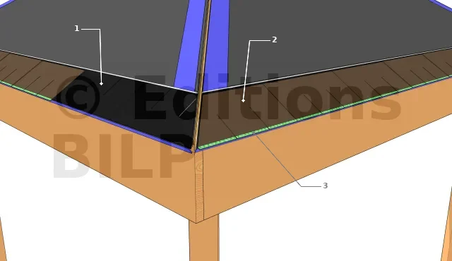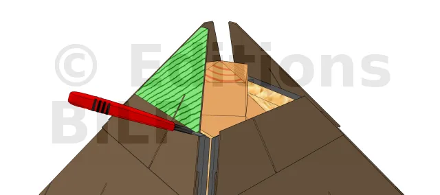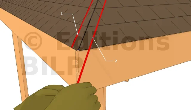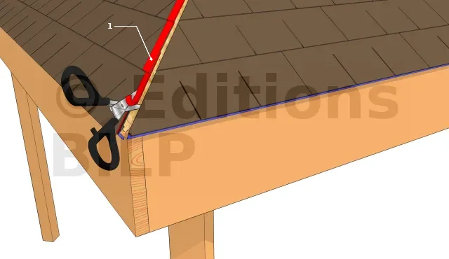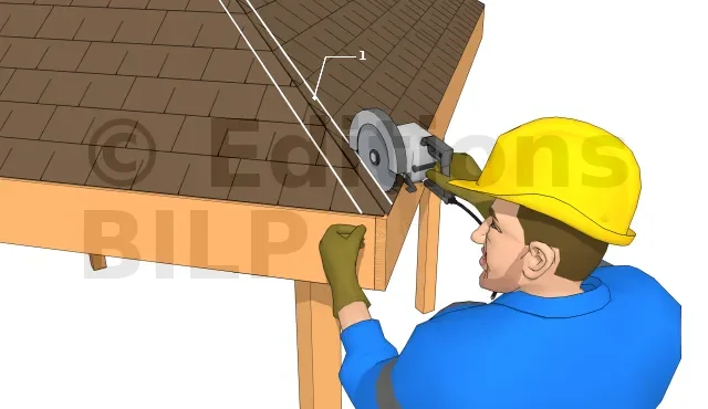 Remplir la première façade du toit de bardeaux jusqu’au sommet. Couper à l’aide d’un cutter bien aiguisé, et suivant la ligne de coupe, les bardeaux qui se trouvent dans la partie à couper le long de la crête. Bien enlever la partie à couper pour pouvoir installer l’évent de faîte par la suite.