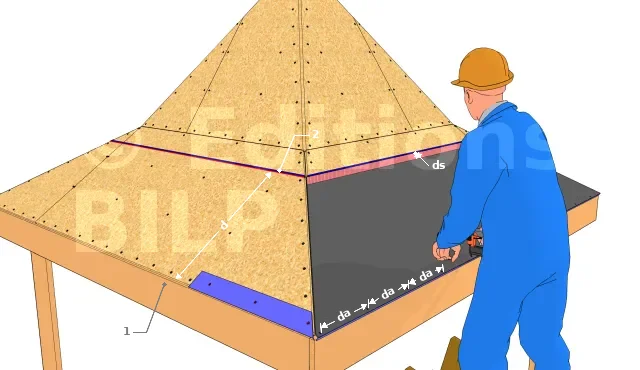 L’ajout d’une couche de papier isolant au dessus des panneaux protège la toiture de l’humidité. Pour aligner une première rangée de papier isolant à gauche, tracer une ligne de repère (avec un cordeau à tracer) à partir de 78 cm de la gouttière et laisser environ 1 cm en plus. Ensuite, en prenant soin d’aligner leurs sommets avec les lignes de repère, placer les papiers isolants permettant une superposition de 5 cm de chaque rangée. Lorsque deux bandes se joignent à un joint vertical, un chevauchement d’au moins 10 cm est indispensable. Enfin, planter soigneusement des agrafes à un intervalle de 30 cm afin de bien les fixer contre les bandes de rives.