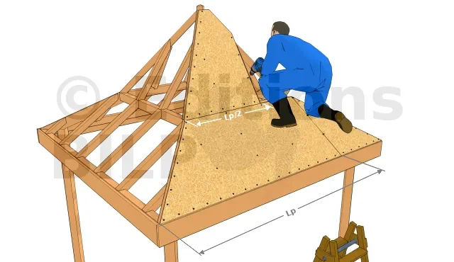 Pour s’assurer que les joints verticaux soient entre les lignes, commencez avec un demi-panneau. La fin du demi-panneau doit tomber à mi-chemin le long d’un chevron. Poursuivre le revêtement du toit jusqu’à la crête mais ne clouez que jusqu’aux environs de 15 cm de la crête. Une zone à découper sera laissée pour plus tard.