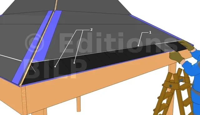 Les bardeaux d’asphalte utilisent un mastic d’étanchéité qui fixe les bardeaux entre eux une fois qu’ils sont chauffés par le soleil. Ainsi, pour fixer les premiers bardeaux sur le bord avant du toit, une rangée de démarrage spéciale est nécessaire. Il s’agit d’une rangée de bardeaux de 18 cm installés à l’envers et placés suivant la ligne de repère.