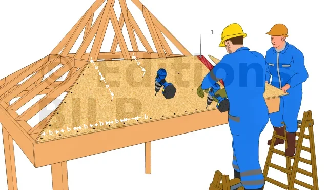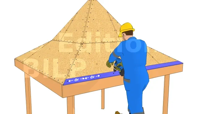 Les panneaux OSB doivent être installés de manière stratégique. En commençant par le coin inférieur d’un côté, placer les longueurs des panneaux OSB perpendiculairement aux chevrons. Il faut s’assurer que les extrémités courtes soient centrées sur les chevrons. Avant de fixer les panneaux aux chevrons avec des clous galvanisés, un espace d’expansion d’environ 1 cm doit être laissé entre les panneaux. Les clous sont plantés tous les 15 cm le long des extrémités, et tous les 30 cm ailleurs.