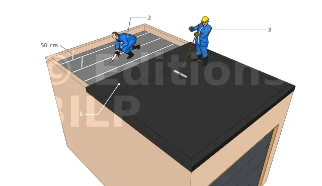 - 2. Etaler de la colle sur toute la largeur de la toiture en progressant petit à petit, par exemple par bande de 50 cm