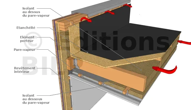 Pour ce type de toiture, la totalité de l’isolant est placé au-dessous de l’élément porteur de l’étanchéité avec une lame d’air ventilée interposée. Ainsi, la sous-face de l’élément porteur comprend un espace ventilé pouvant communiquer avec l’air extérieur. L’isolant est placé sous la lame d’air.